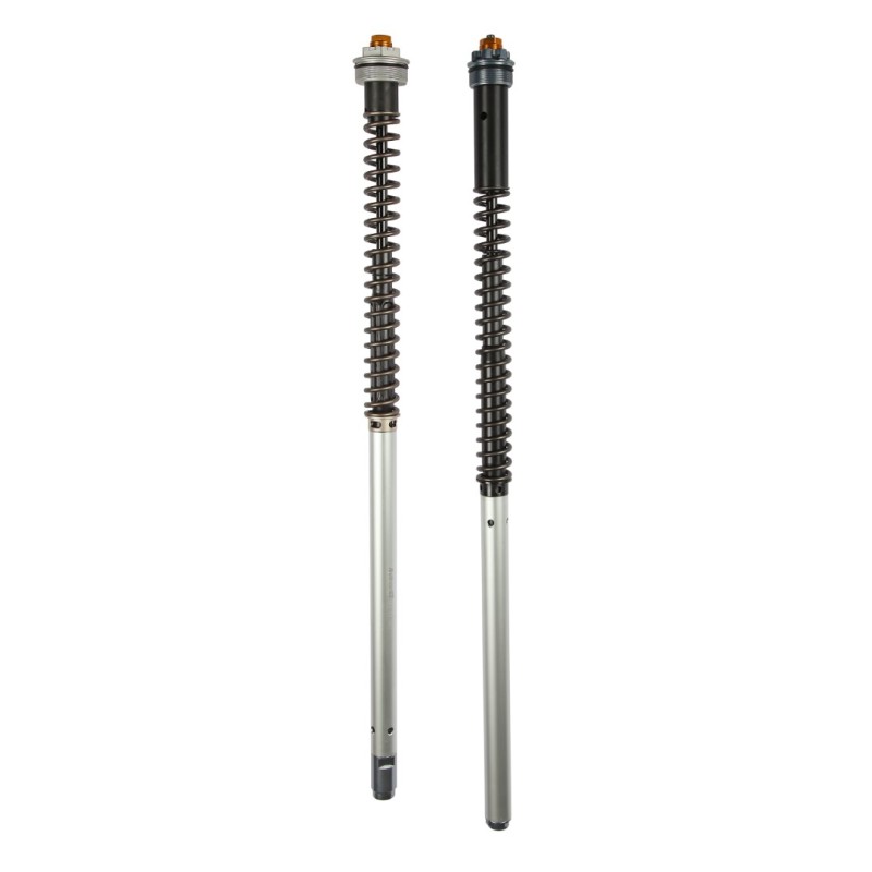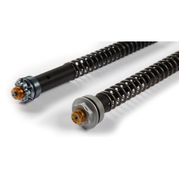 The cartridge kit is designed to replace internal fork parts to improve performance. The kit contains two cartridges, two springs, two fork plugs with adjustments and assembly instructions. This assembly allows 3 points of front-end adjustment: