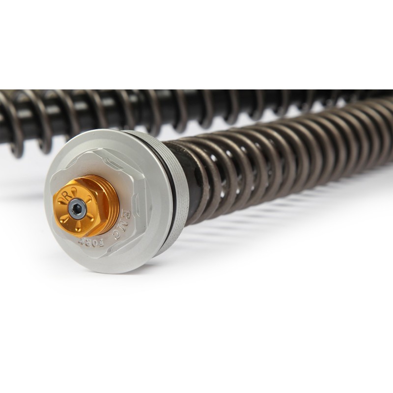 Le kit cartouche a la particularité d’être réglable d’un côté en hydraulique de détente et de l’autre en compression puisqu’un bras de fourche contrôle la détente (R pour Rebound) et l’autre bras la compression (C pour Compression).